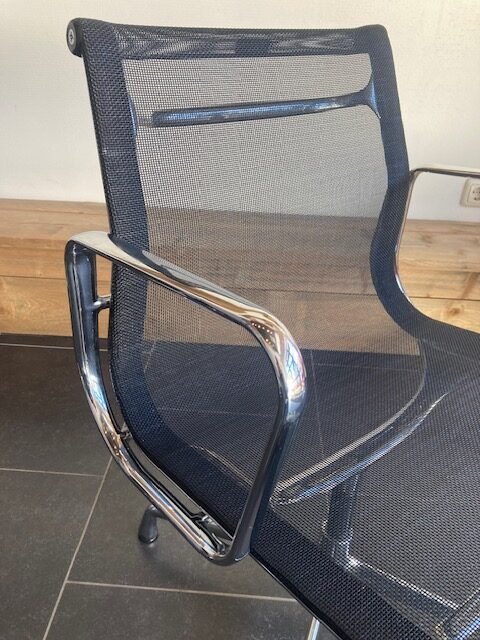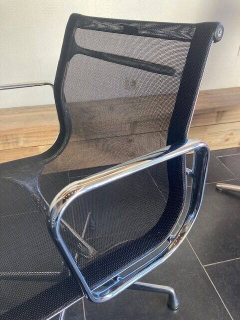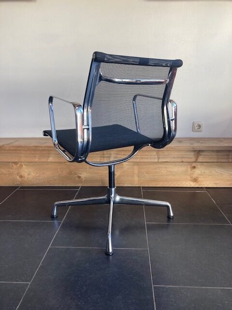 6 Vitra Eames EA 108 stoelen, chroom, zwart netweave