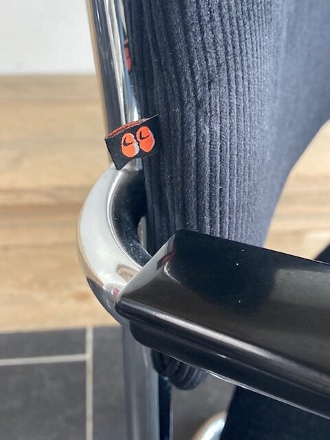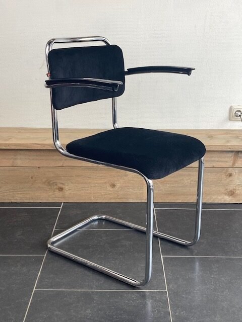 De stoelen zijn opnieuw gestoffeerd in zwarte ribstof door een ervaren stoffeerder van Dutch Originals.