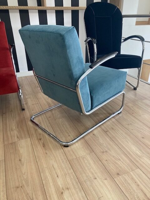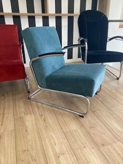 De fauteuil is opnieuw gestoffeerd in lichtblauwe ribstof.