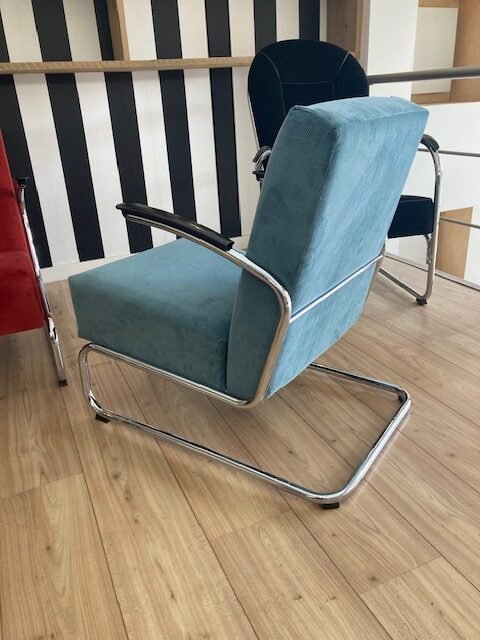 Gispen 405 fauteuil, chroom, nieuwe lichtblauwe ribstof