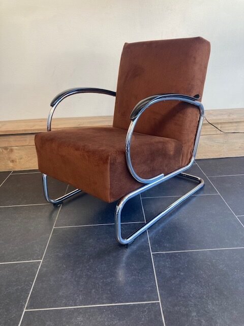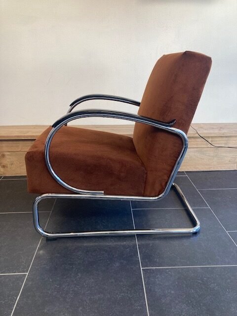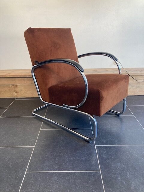 Gispen 407 fauteuil, chroom, nieuwe cognac bruine ribstof