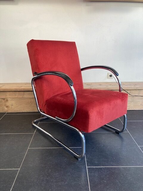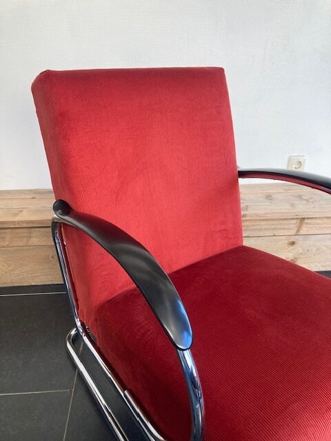 De fauteuil is opnieuw gestoffeerd in terra ribstof.