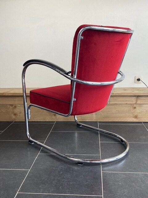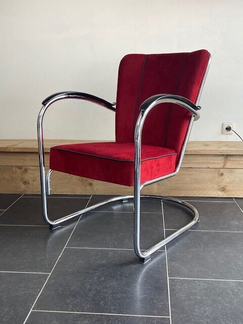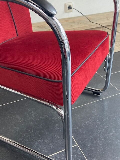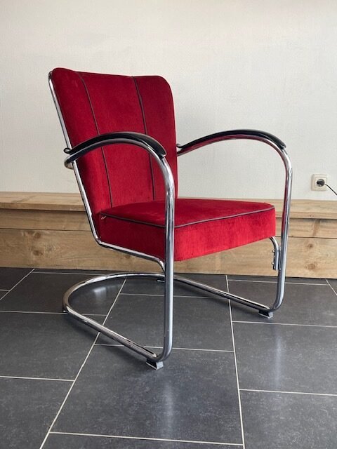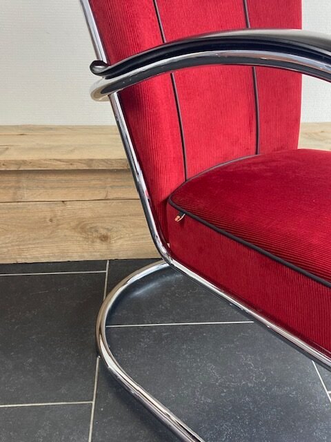 Gispen 412 fauteuil. chroom , nieuwe donkerrode ribstof