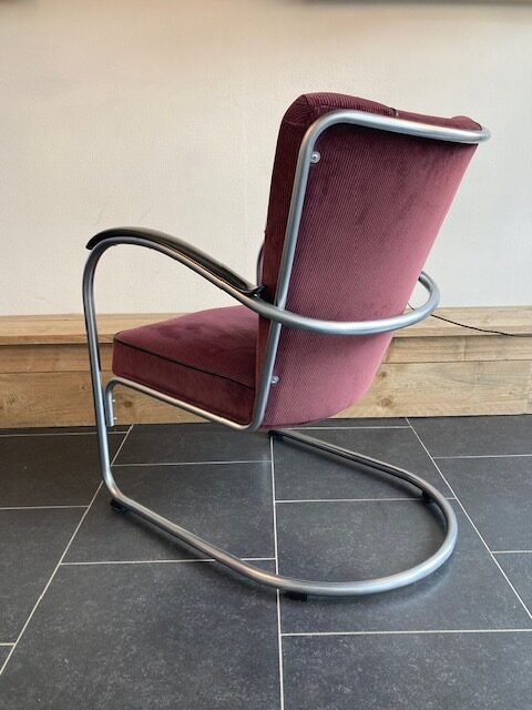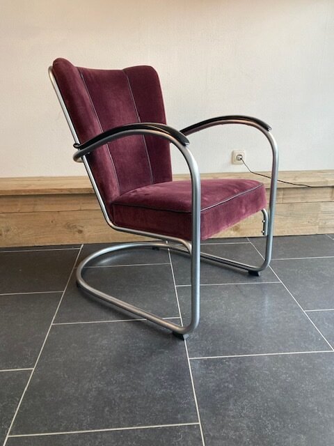 Gispen 412 fauteuil, zijdemat frame, paarse ribstof